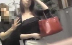 後ろから無理やりおっぱいポロリ!乳首を隠した後で犯人を捜しても誰もいない