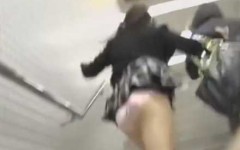 階段でスカートめくり「やめなさいよ!」パンツ丸出しで追いかけてくる強気な娘